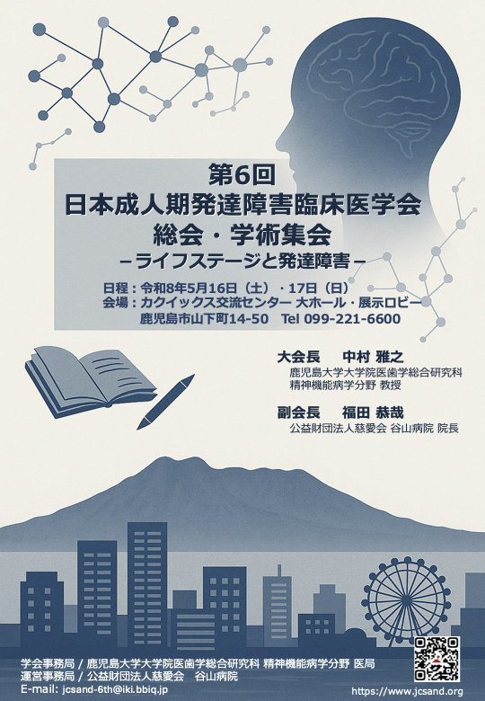 令和8年5月16(土)・17日(日)カクイックス交流センターにて、鹿児島大学病院と公益財団法人慈愛会谷山病院の主催で第6回日本成人期発達障害臨床医学会が開催されます。